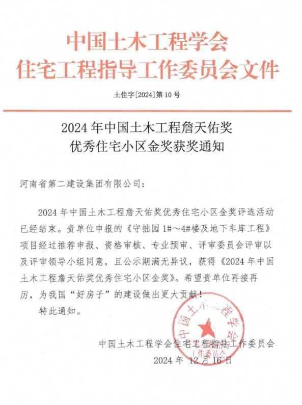 近日,中国土木工程学会住宅工程指导工作委员会发布通知,由集团公司建设的守拙园1#—4#楼及地下车库工程荣获“2024年中国土木工程詹天佑奖优秀住宅小区金奖”,系我公司首次斩获该奖项。