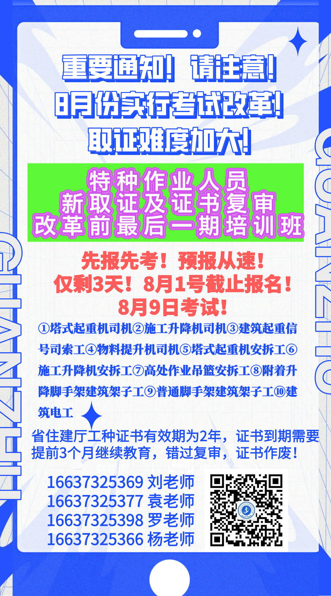8月9号考试!特种作业人员 新取证及证书复审 改革前最后一期培训班!